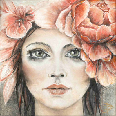 Geschlossene Augen, ein leises Stillleben, balancierend auf ihrem Haupt. Eine zarte Schönheit entfaltet sich. Die Elemente der Natur sanft zu einem Kunstwerk vereint.